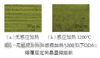 DD4定向晶修復(fù)DZ125L葉片的研究LCD高溫合金時,高溫合金具有很高的裂紋敏感性,裂紋一般表現(xiàn)為沿晶界開裂,并順著沉積方向擴展,嚴重影響高溫合金的力學(xué)性能。而利用感應(yīng)加熱來輔助LCD能夠很好地解決這些問題。通過感應(yīng)加熱可有效減小基體與熔覆層之間的溫度梯度,一方面可以消除微觀缺陷(微氣孔和夾渣等);另一方面可以有效消除高溫合金裂紋的形成。故感應(yīng)輔助LCD技術(shù)可有效提高高溫合金定向凝固組織的性能(見圖7)。 通過感應(yīng)加熱來控制DD4實體成形過程中的散熱方向和正溫度梯度,可以獲得完整均勻外延生長的DD4柱狀定向晶。