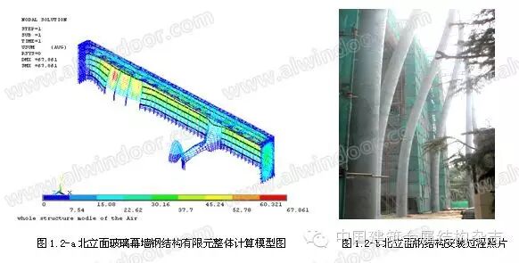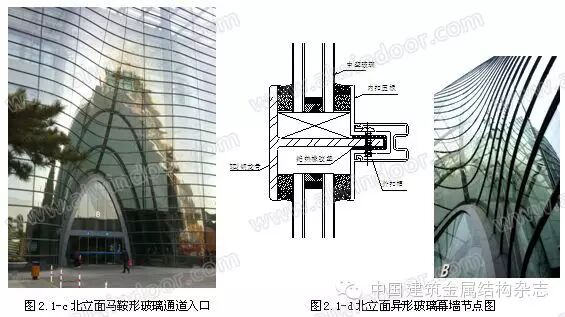 在建筑物北立面幕墻與東、西立面幕墻的銜接過渡處的弧形面是由兩段不同半徑的弧面銜接過渡,避免通常情況下的直角銜接;在北立面玻璃幕墻的西側(cè),局部為凹球型玻璃表面,而球面與平面銜接處為順滑過渡的空間三維曲面。其設(shè)計、加工及安裝難度,迄今為止均為國內(nèi)幕墻業(yè)所不多見。整個建筑物線條流暢合理,與周圍建筑物益顯和諧。(如圖1.1-b、c)