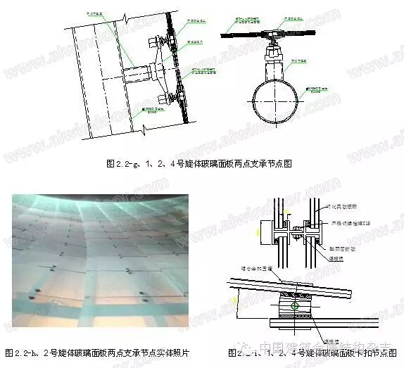 為解決技術(shù)難題,在設(shè)計中根據(jù)工程特點發(fā)明了新的節(jié)點并使用在本工程上:雙頭連接駁接頭、可調(diào)式轉(zhuǎn)角支承爪件、雙層玻璃定位夾等,都是針對本工程設(shè)計的特殊節(jié)點。既解決了設(shè)計于施工難題又滿足了建筑造型的要求。在結(jié)構(gòu)設(shè)計上充分利用******的結(jié)構(gòu)計算軟件建立四個旋體的空間模型,對旋體的每一條桿件都進行靜力學和動力學的分析.確保結(jié)構(gòu)的安全性。由于造型的需要在1號、2號、4號玻璃旋體上玻璃板塊為上下兩點支承,玻璃之間為開縫式,上下玻璃板塊對接,左右玻璃板塊錯位搭接的連接方式來實現(xiàn)整個玻璃旋體的雙曲面造型。由于玻璃板塊與旋體的空間鋼結(jié)構(gòu)的連接是采用在玻璃板塊的中部固定的,用玻璃板塊的上、下兩點來支承板塊所受的荷載。這種連接方式雖然能解決了玻璃板塊自重和水平荷載的傳遞。(如圖2.2-h、i)但同時又出現(xiàn)了板塊平面外不穩(wěn)定的問題。為了能在不增加結(jié)構(gòu)連接件的情況下,解決玻璃板塊平面外固定的問題,我們專門為該項目設(shè)計了玻璃面板卡扣式連接節(jié)點,也叫雙層玻璃定位夾。(如圖2.2-g)
