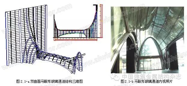 采光頂采用隱框作法,玻璃為中空鋼化夾膠玻璃。排水坡度為3%。根據(jù)建筑物的功能要求設(shè)置13個電動通風排煙窗。為避免夏季陽光的過度照射,在采光頂?shù)氖覂?nèi)我們設(shè)置了玻璃遮陽百頁。合理的節(jié)點設(shè)計和材料組合保證幕墻的功能要求。在屋面的頂部,球形天文望遠鏡的周邊安裝了多個無使用功能的玻璃體造型,其結(jié)構(gòu)都是由鋼結(jié)構(gòu)支承的點支式玻璃幕墻,實現(xiàn)的效果是在室內(nèi)的玻璃旋體穿透屋面與天空相呼應(如圖1.2-d、e)2、節(jié)點設(shè)計2.1、馬鞍形玻璃通道與南北立面異形幕墻在建筑物中部設(shè)置了一個由曲形鋼結(jié)構(gòu)支撐,用360片不同尺寸、不同規(guī)格的雙曲面熱彎夾膠玻璃拼接而成的馬鞍形玻璃通道,這個通道貫穿整個建筑。它將北立面的曲面玻璃幕墻和南立面的石材幕墻連接。它的特殊之處在于極具創(chuàng)造性的利用鋼結(jié)構(gòu)和雙曲面玻璃組成連續(xù)的馬鞍形空間雙曲面,實現(xiàn)了一個富有想象力的夢幻空間。(如圖2.1-a、b、c)