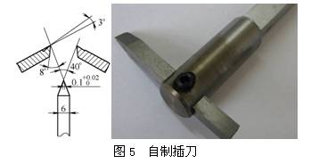 (2)自制刀具,解決非標(biāo)刀具。從圖1所示可以看出,測速頭鐵心的齒寬和齒間距僅0.315mm,齒深0.3mm,精度高,需要插刀進行插削加工成形。由于插刀為非標(biāo)刀具,需要根據(jù)加工零件的形狀尺寸進行設(shè)計自制刀具。根據(jù)零件材料的加工特性,選材、刃磨、試驗,試驗***終選擇如圖5所示的YG8硬質(zhì)合金材質(zhì)進行刃磨加工,其刀心寬0.1mm,中心對稱度為0.01mm,計量合格后使用。